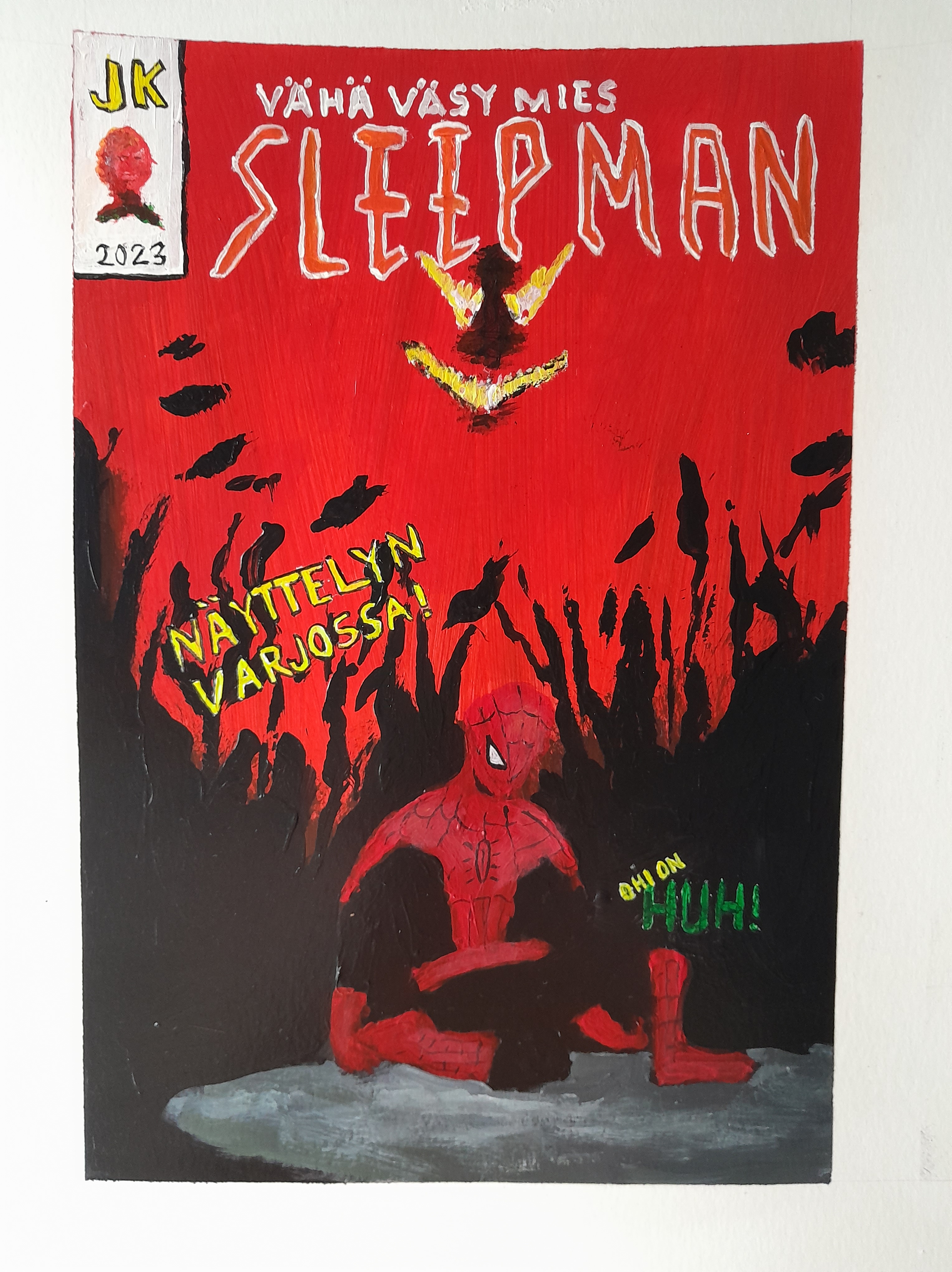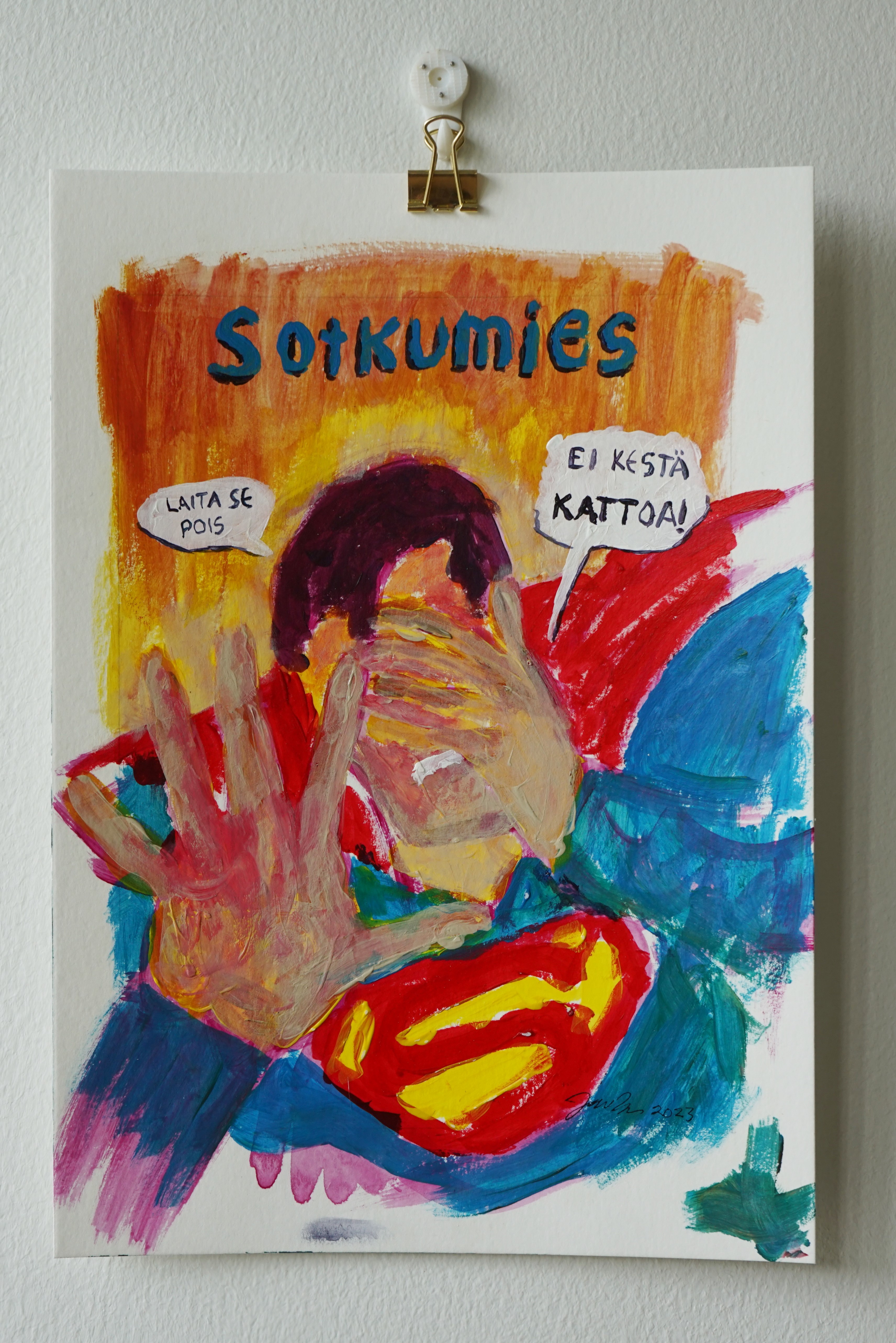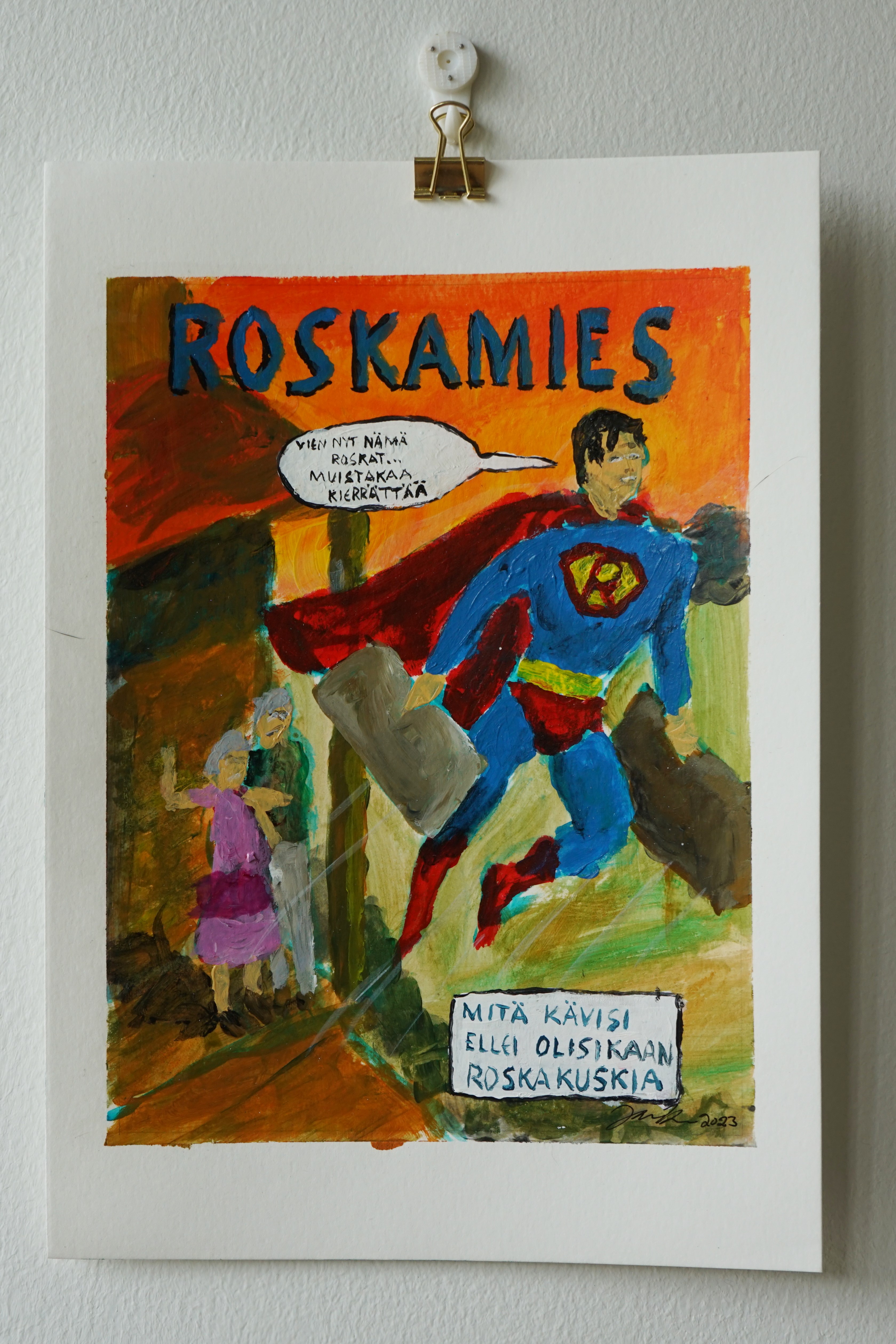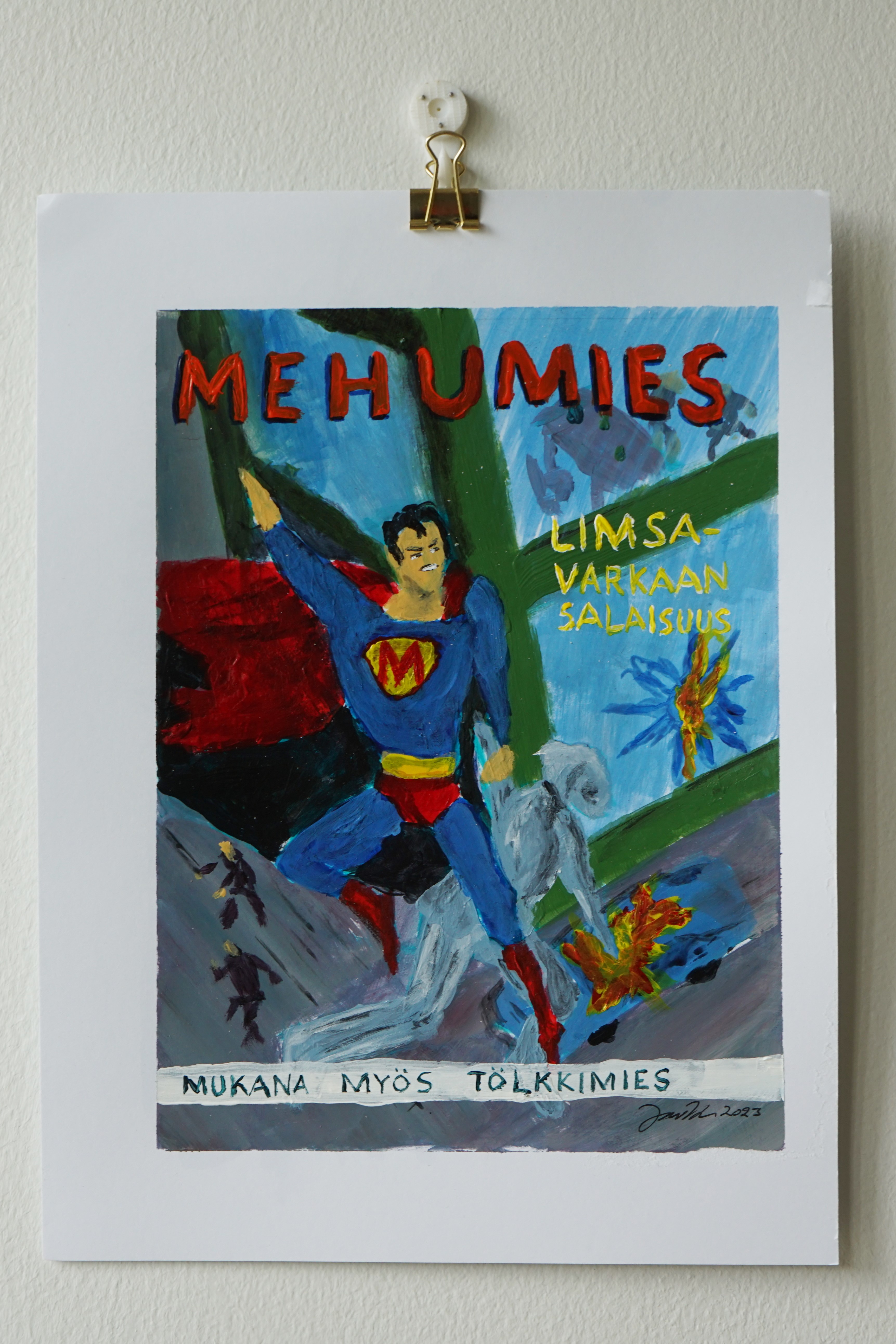 Viime aikoina olen miettinyt sankaruutta sarjakuvien kautta. Tämän sarjan teosten inspiraationa ovatkin sankarisarjisten kannet. Sarjakuvat ovat pääasiassa joitain supersankarisarjakuvia tai korkkareita. Näissä kannet ovat usein melko mahtipontisia, sankari sankaroi niissä ankarasti.