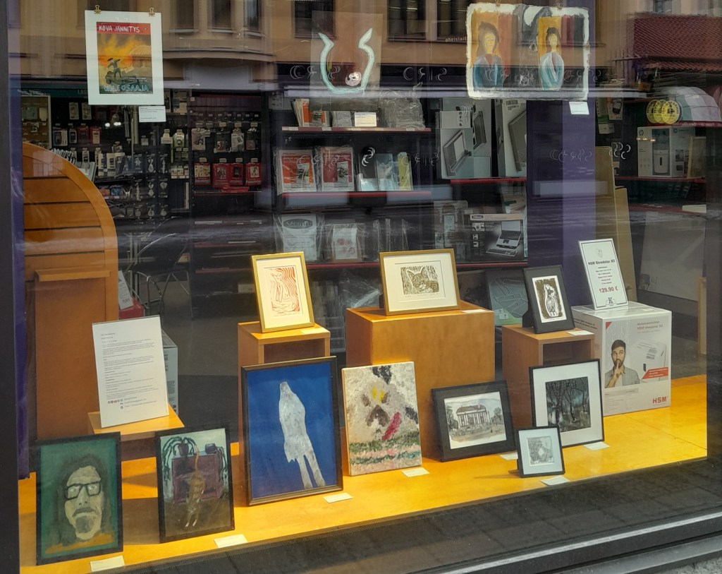 Olin taannoin muussa asiassa yhteydessä Turun Kansalliseen kirjakauppaan ja sieltä heitettiin ehdotus, että laittaisin töitä Linnankadun myymälän ikkunaan. En ollut ajatellut mitään kummempia näyttelyitä tälle vuodelle edes harkita, mutta en ole myöskään niin pöllö, että jättäisin syliin tiputettavan mahdollisuuden käyttämättä.
