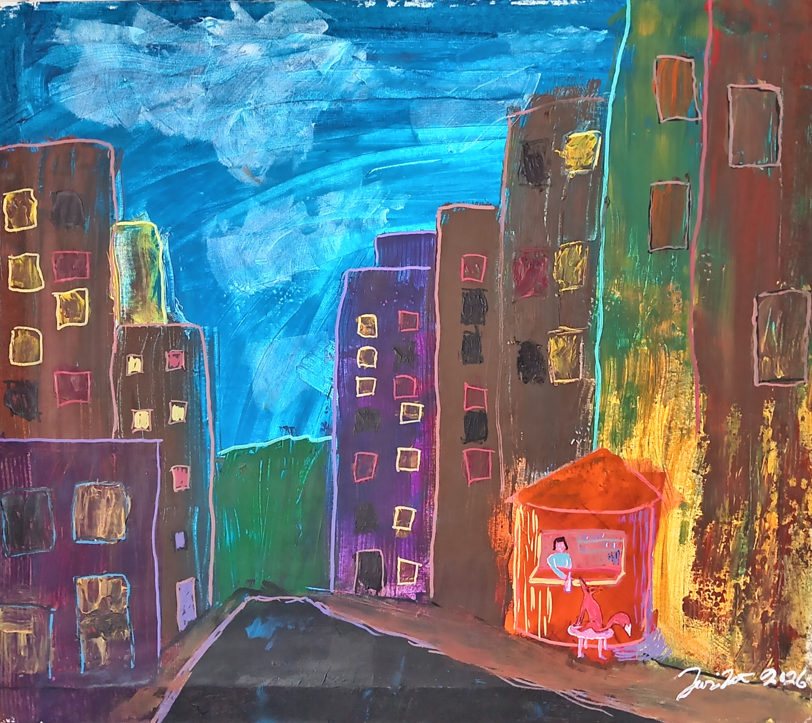 Akryylimaalaus on nopeaa, koska maalit kuivuvat nopeasti. Välillä kuivumisaika tuntuu liiankin lyhyeltä, mutta sen kanssa oppii elämään. Se on näiden maalien ominaisuus. Etuna on kuitenkin se, että voin jatkaa työskentelyä uusien kerrosten parissa puolessa tunnissa maalin levittämisestä. Suosin akryylimaaleista erityisesti Talensin ja Daler Rowneyn laadukkaita värejä, jotka ovat laadukkaita ja melko sopuhintaisiakin.